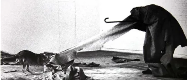 Must we hang everything on a wall? Crushed together as if the artists were the best of friends, members of a club in which they all agreed to be exhibited side – by – side. Beuys would be appalled to end up as a film clip on a tiny screen nestled alongside Abramovich whose piece on display, She Wolf, was a direct rip-off of his piece ‘Coyote’: though not acknowledged at this exhibition.